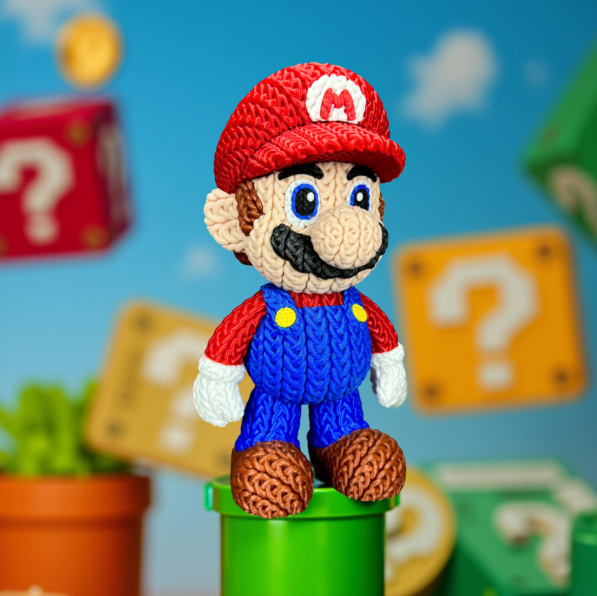 Figurine Mario au style tricot, imprimée en 3D, d’une hauteur d’environ 46 cm. Un design unique et original qui imite parfaitement l’effet du tricot.